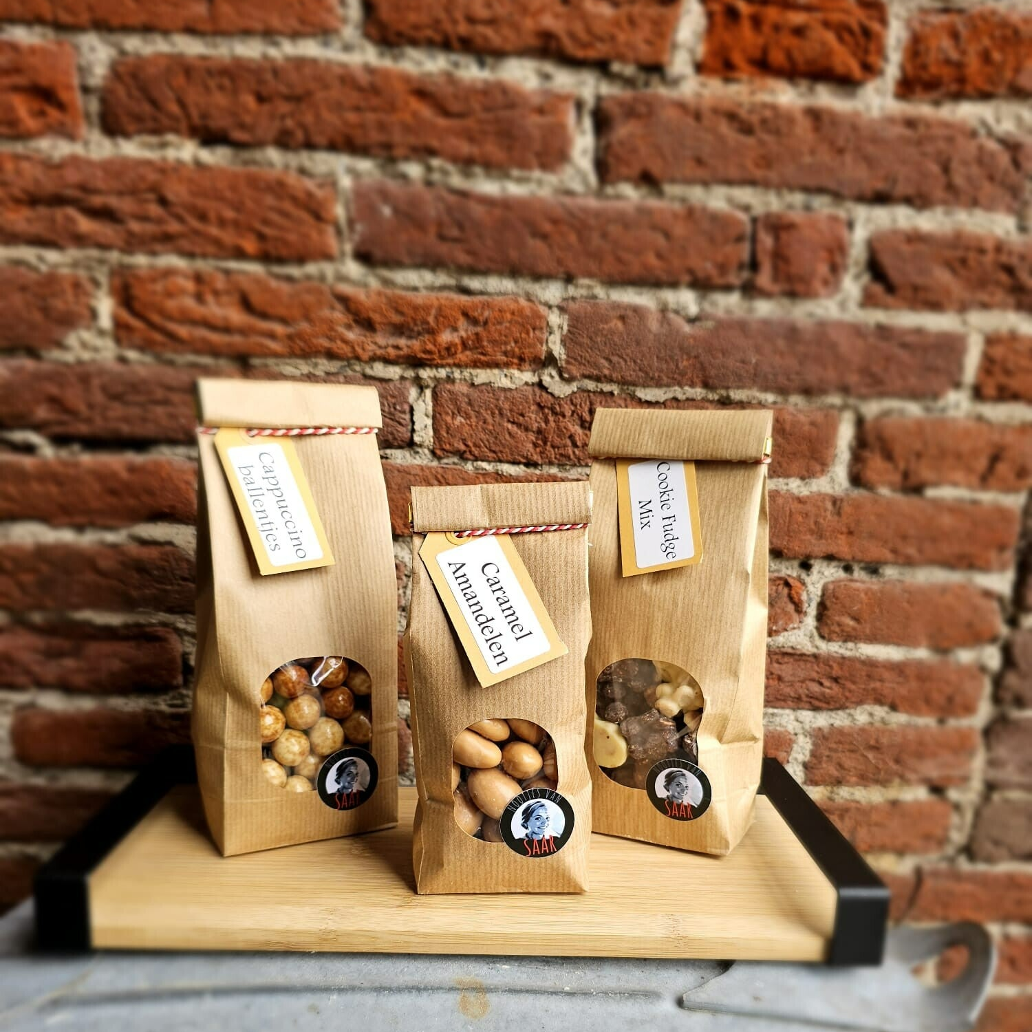 Houten dienblad met 2 grote zakjes Cookie Fudge Mix en Cappucino ballentje en klein zakje met Caramel Amandelen
