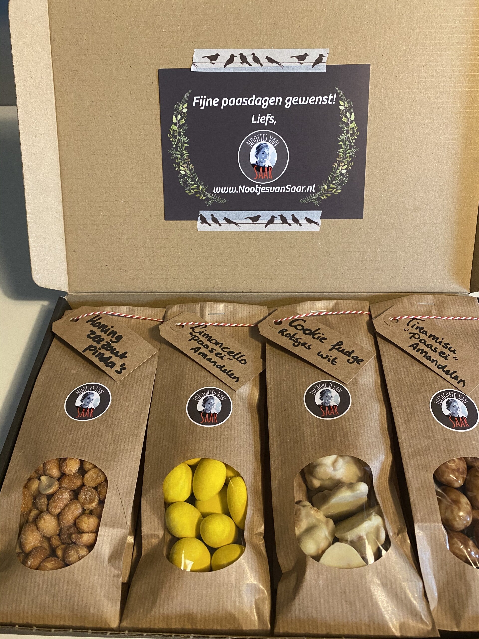 Met: witte cookie fudge rotsjes, limoncello amandelen, honing zeezout pinda’s en tiramisu amandelen.