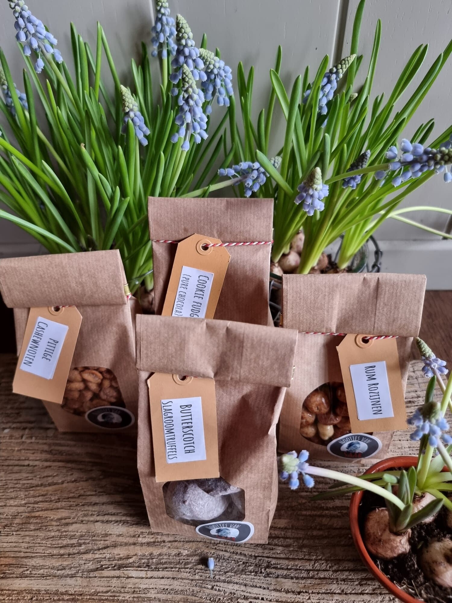Pakketje 1: butter scotch truffels, cookie fudge rotsjes puur, pittige cashewnoten en rum rozijnen.