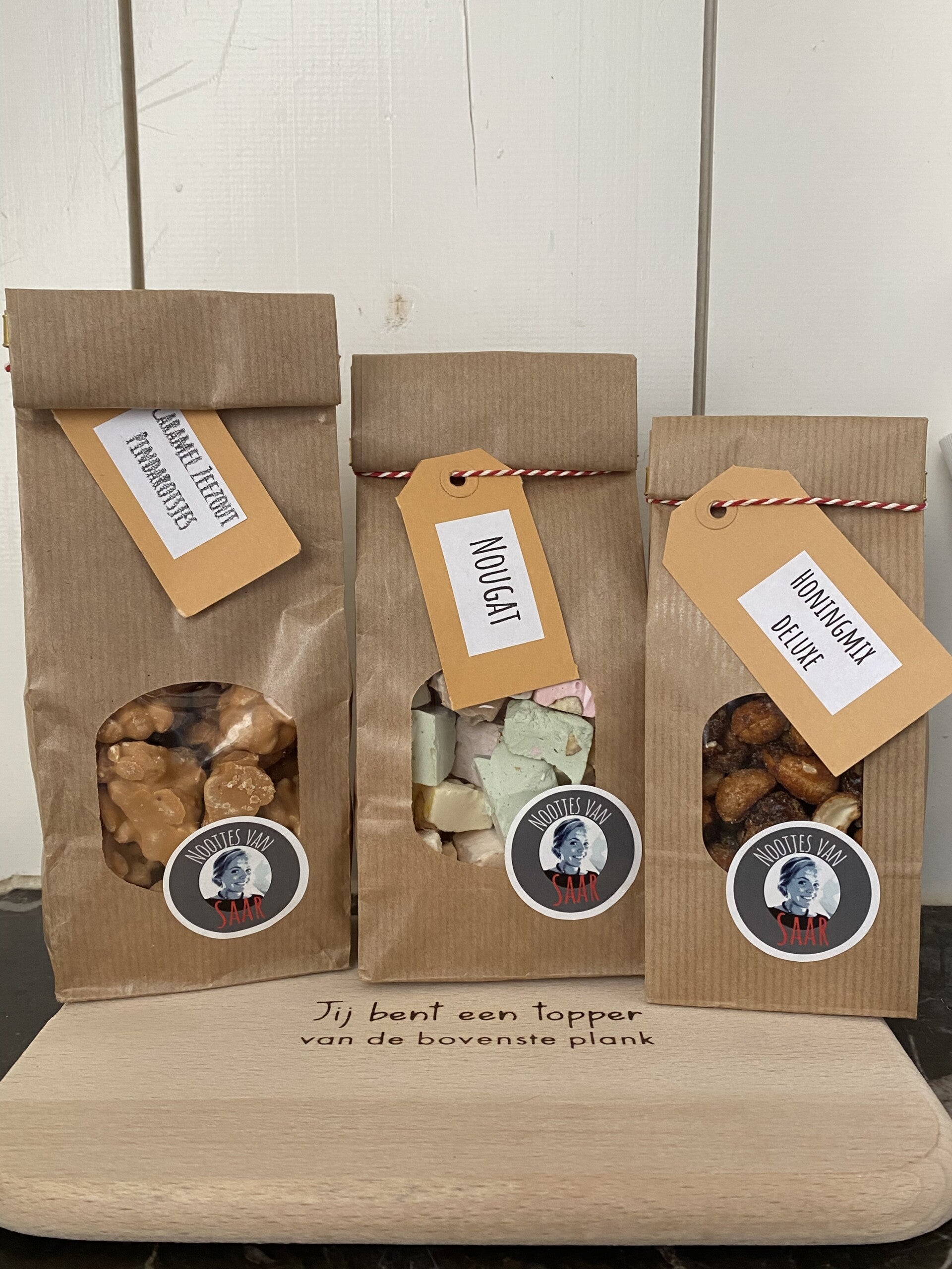 Plankje met honing mix deluxe, nougat en caramel zeezout pinda rotsjes
