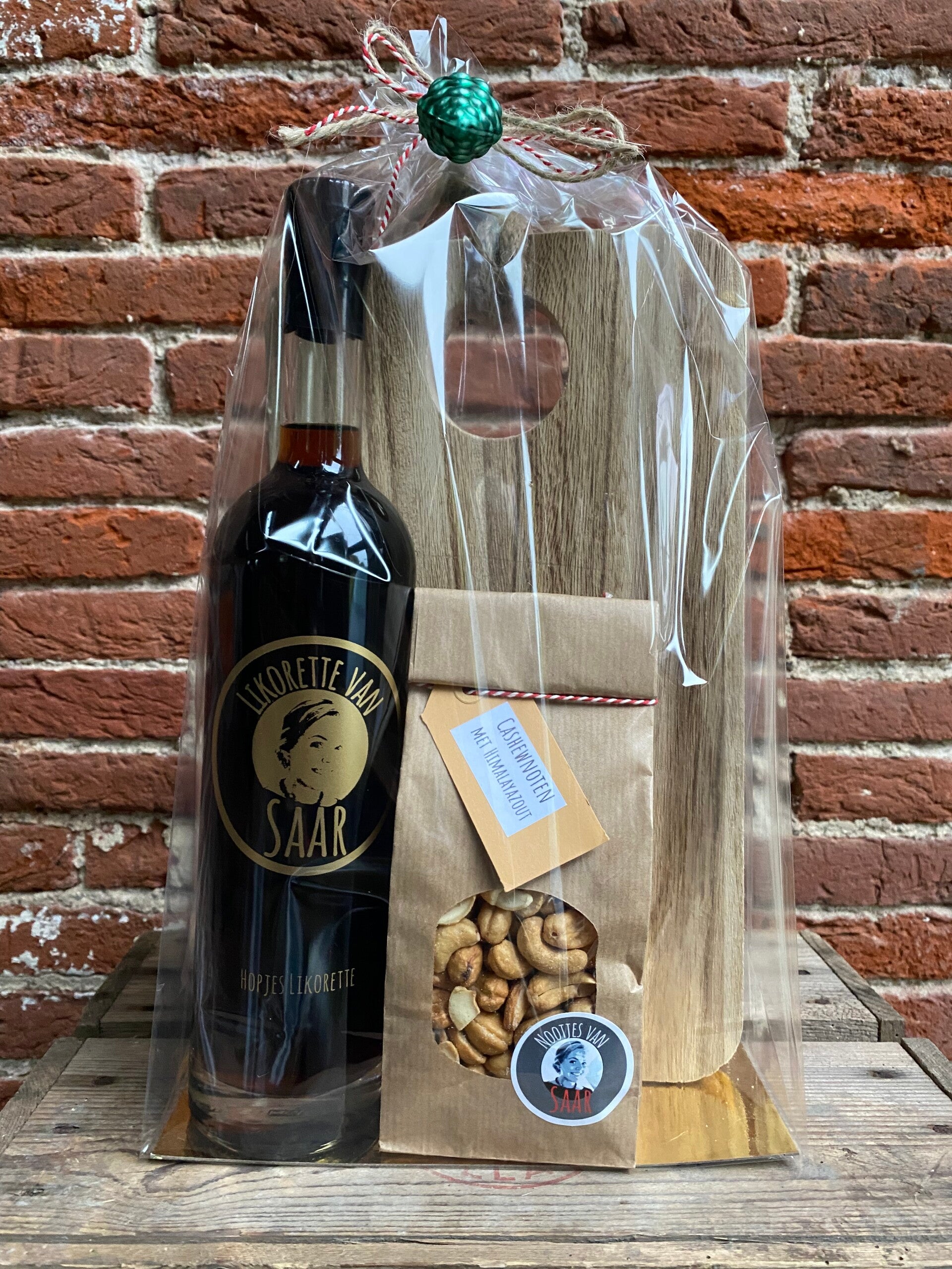 Pakketje met: Een mooi plankje, een fles likorette van Saar en cashewnoten met Himalaya zout
